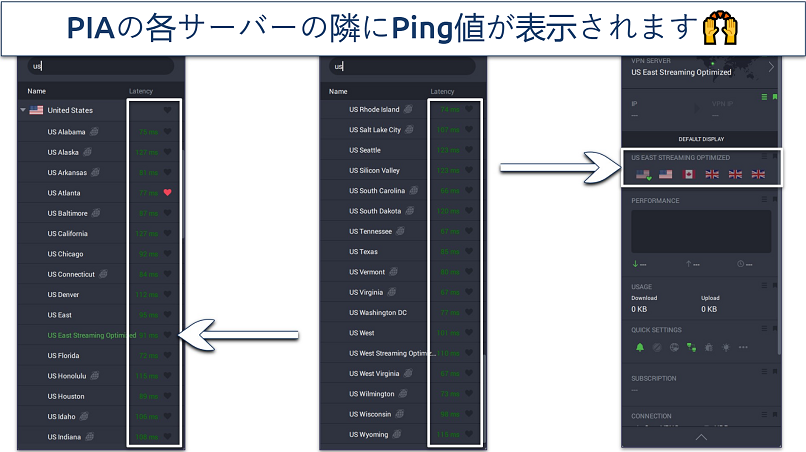 PIAの注目ポイントは、サーバー台数が他社よりはるかに多いことです。この記事でアメリカの全州にサーバーがあるVPNはPIAだけで、米国全土で安定した高速通信を実現しています。また、アメリカのIPアドレスを取得し、どこからでも現地のスポーツイベントを安全に視聴するためにも最適です。アメリカのストリーミング専用サーバーは2台あり(東海岸と西海岸)、当社調べでアメリカ版Netflixなどアメリカのストリーミングサービスが利用できました。