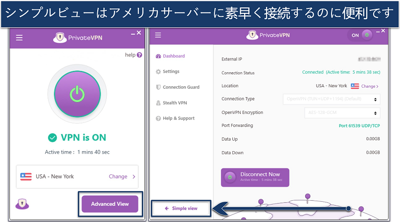 PrivateVPNは使いやすく、初心者にピッタリです。アプリは容易に設定でき、Simple View(シンプルビュー)で簡単にアメリカに繋がります。一覧から近距離サーバーを選び、ワンクリックで接続するだけです。
