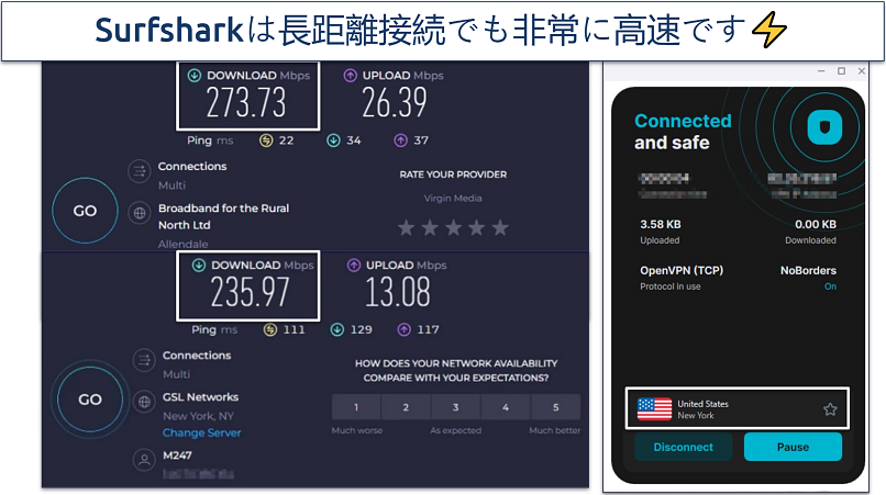 Surfsharkは高速で、アメリカ国内外であらゆるオンラインアクティビティに適しています。近くのサーバーでも遠くのサーバーでも通信速度は7~11%しか低下しませんでした。The New Yorkerなどのサイトや人気ストリーミングサービスが表示されるのにほとんど時間はかかりませんでした。HD・UHD画質で映画やドラマを見たり、ラグなしでゲームをプレイしたりするのに十二分なスピードです。