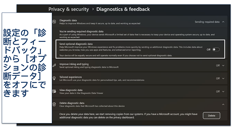 Windowsで一部の設定を変更するとゲームのパフォーマンスが改善されることがあります。Windows 10とWindows 11はPCのリソースをゲームに優先させる「ゲームモード」が内蔵されています。また、Windowsの設定で[オプションの診断データを送信]がオフになっていることを確認しましょう。オンになっているとCPU使用率が高くなりがちです。