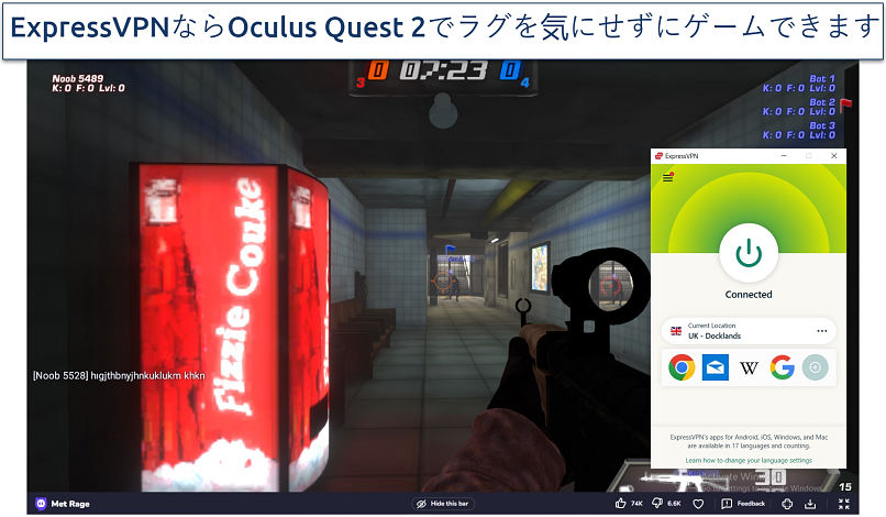 ExpressVPNは安定した高速通信で他社と差をつけており、Oculus Questに一番おすすめのチョイスとなっています。この背景にあるのは独自プロトコル「Lightway」です。VRヘッドセットなどのポータブルデバイスのバッテリーへの負担を抑えつつ、高速で安定したスピードを実現するように最適化されています。イギリスのメンバーが試したところ、英国サーバーに接続中、通信速度は平均で8%しか低下しませんでした。ゲーム中に遅いと感じなかったそうです。
