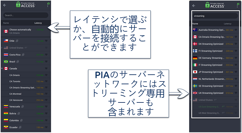 - マルチプロトコルに対応。PIAはIPSec(iOS版)、OpenVPN、WireGuardを提供しています。動画再生とゲームにはWireGuardが最速です。また、OpenVPNでは接続設定をカスタマイズしてスピードアップを狙うこともできます。