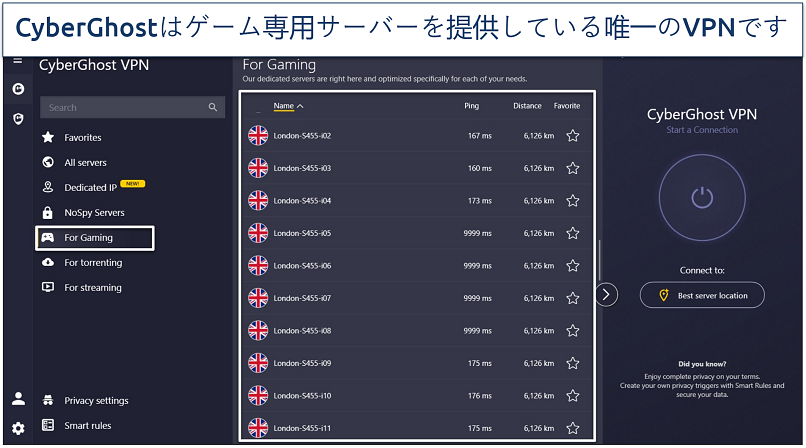アメリカのスピードテスターの調べによると、米国内のサーバーでは平均で12%の速度低下となりました。イギリスのメンバーが近くのサーバーを使ったときも結果は同様でしたが、遠くのサーバーでは大きな速度低下が見られました。さらに、CyberGhostのゲーム専用サーバーのPingはアプリに表示されます。Ping値が低いサーバーを選べばラグを抑えられるわけです。