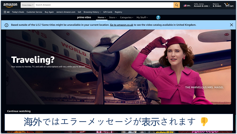 もし通常の位置と現在地が一致しなかった場合、プライムビデオのライブラリには通常の位置以外で配信されているタイトルのみが表示されます。そのようなケースでもアマゾンプライムの一部コンテンツが視聴可能です。例えば、通常は日本在住の利用者が海外からアマゾンにアクセスしようとすると、下のエラーメッセージが表示されます。