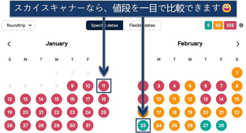 複数の日付を検索したり、近くの他の空港から出発する便も検索したりすると安いチケットが見つかる可能性があります。通常、平日便、早朝便、深夜便は安い傾向があります。別の空港に到着してバスや電車などを利用して最終目的地に移動することも検討しましょう。