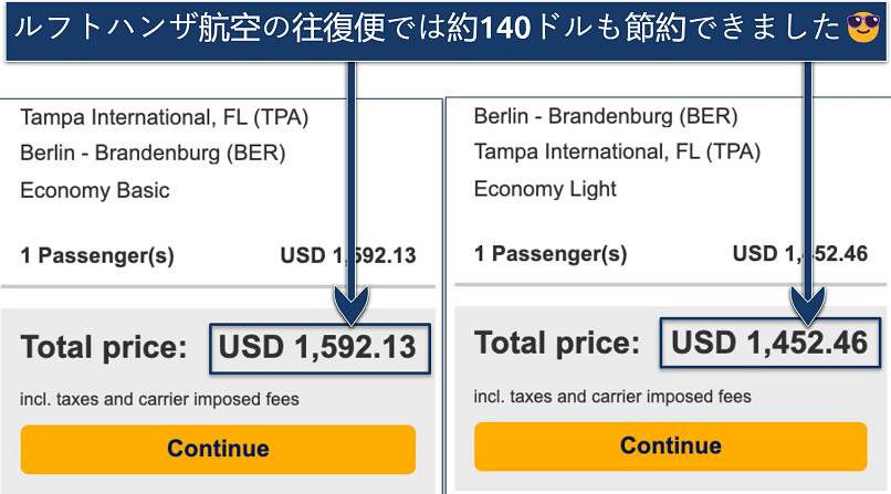 VPNを使うと異なる国の運賃を比較できるため、格安航空券を見つけるのに役立ちます。通常、航空会社はユーザーの位置情報をもとに異なる値段を表示します。裕福な国では高い値段が表示されるのです。東南アジアなどのVPNサーバーに接続すると現地の価格が表示され、20~40%安くなることがあります。しかし、実際にどれくらい節約できるかというのは経路、タイミング、出発地点などによります。