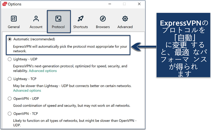 難読化が正常に動作するよう、ExpressVPNは自動プロトコルを推奨しています。プロトコルを自動に設定するには、[オプション] > [プロトコル] > [自動]の順にクリックしてください。