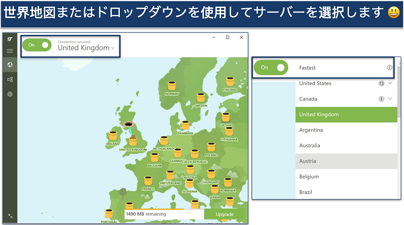 - 強力な暗号化。 AES-256-GCM暗号化により、データは安全です。無料のVPNでは停止スイッチ(Kill switch) が提供されていないため、停止スイッチ(Kill switch) を使用するにはアップグレードする必要があります。