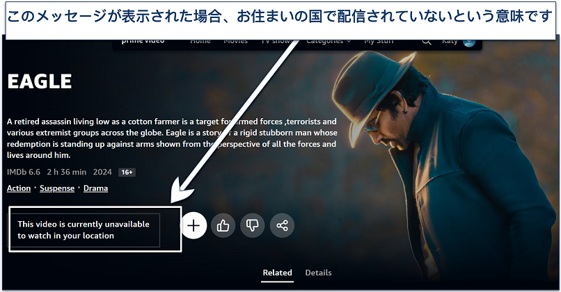 Amazonプライムビデオはほとんどの国で利用できますが、中国本土、イラン、北朝鮮、ロシア、ベラルーシ、シリアは例外です。また、配信許諾契約の関係で、Amazonプライムビデオで視聴可能なコンテンツは地域によって異なります。お住まいの地域で配信されていないタイトルを視聴しようとすると、下記の通知が表示されます。